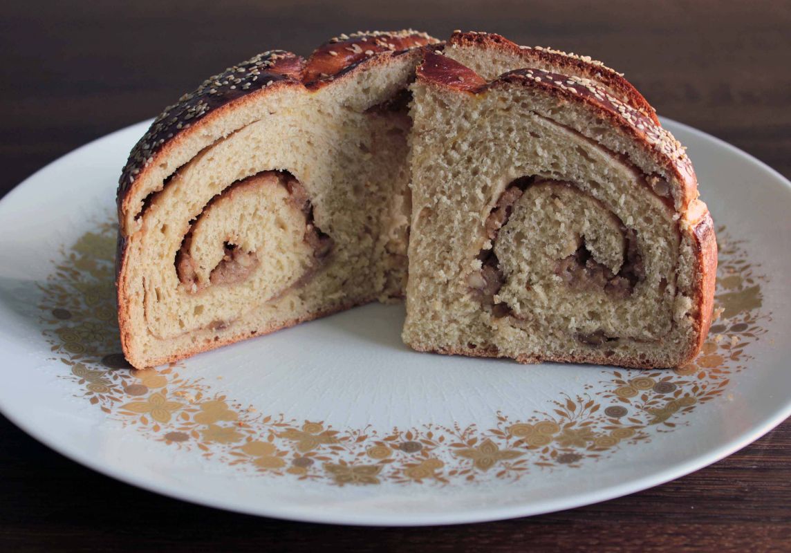 Das erste Rezept, das ich aus diesem Buch gebacken habe, ist dieser Hefekuchen mit Tahin-Füllung. Er war sehr, sehr gut 😊. Als Grundrezept habe ich den Hefeteig für Challah verwendet. Für das Rezept wird eine 8-inch Backform mit Springboden empfohlen, das entspricht etwa 20 cm Durchmesser. Meine Springform hat nur 18 cm, dadurch ist der Hefekuchen etwas höher geworden.