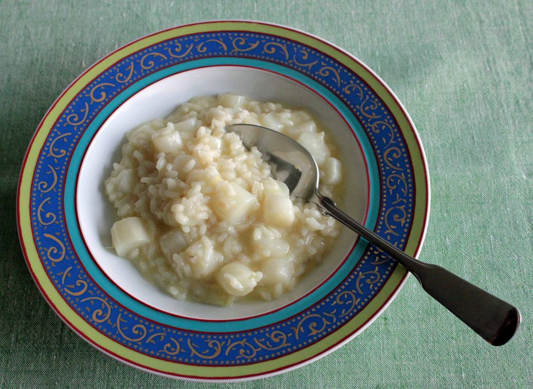 Risotto ist bestens geeignet, um den zarten Geschmack von weißem Spargel zu unterstreichen. Das sanfte Cremeweiß passt als Farbe sehr gut zu diesem Gericht. Kräuter oder grüne Erbsen als Dekoration würden hier nur ablenken.